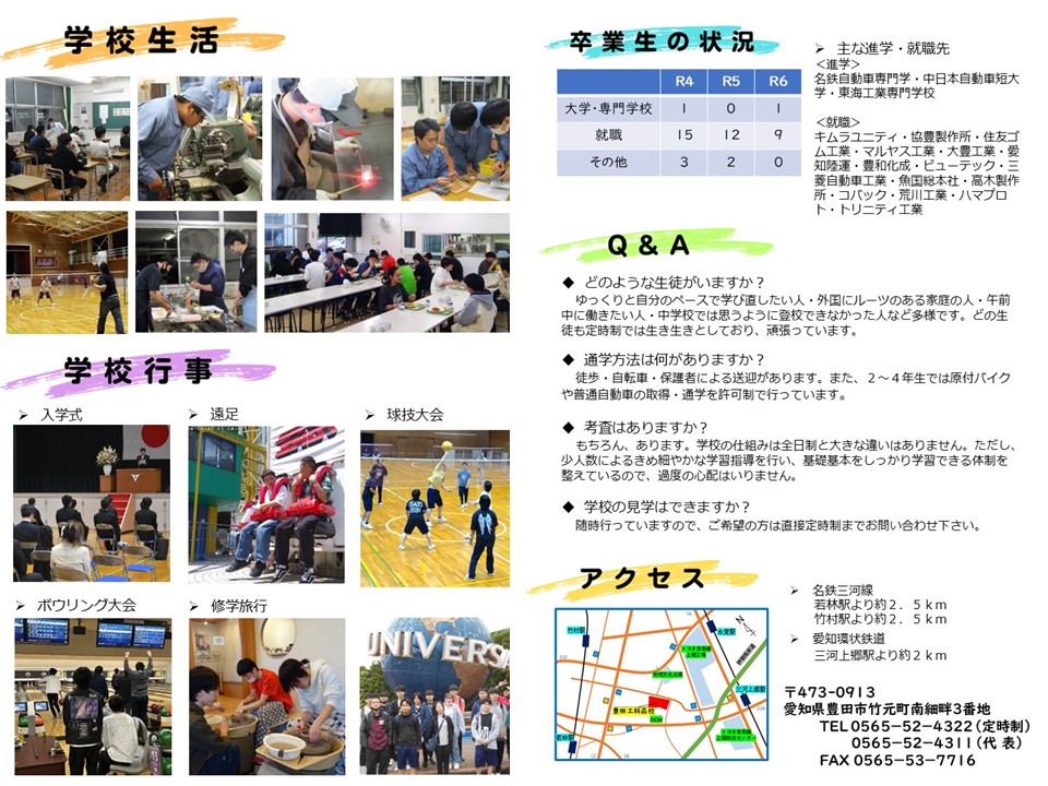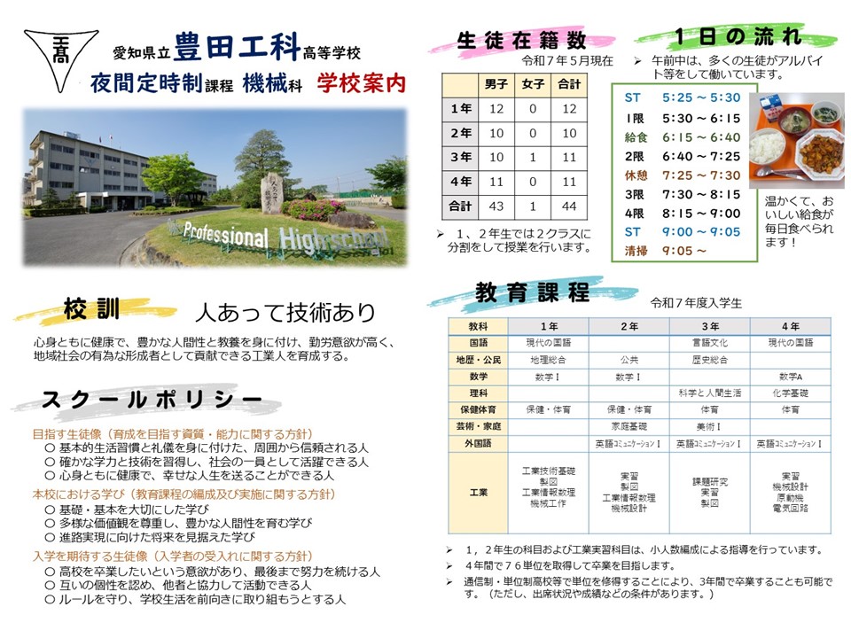☆令和7年度 学校案内☆ CATEGORY 定時制 ☆定時制よりお知らせ☆ ・特にありません 夜間定時制 ご案内 学校長より 資格取得 沿革 Q&A 学校案内 アクセス 校章・校訓・校歌 証明書の発行について 設置学科 地震対策 年間行事 感染症による 出席停止について 就職・進学状況 いじめ防止基本方針 R7年間行事予定表 本校のルールとマナー ラーケーションリーフレット